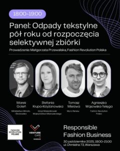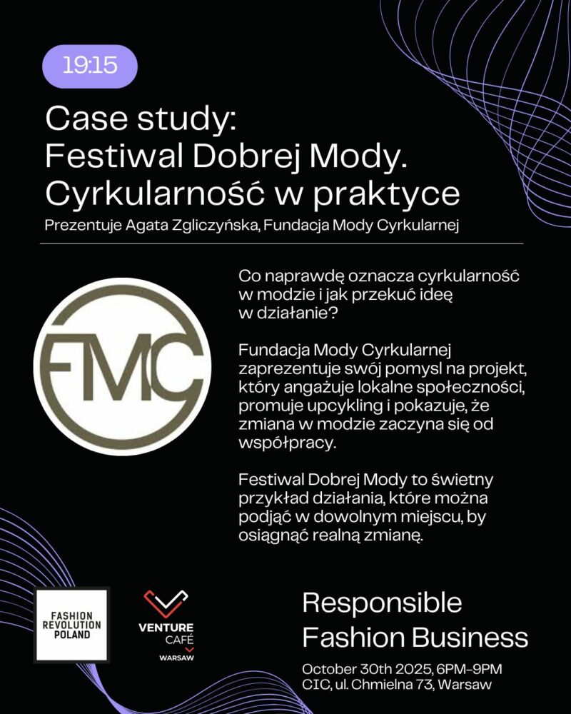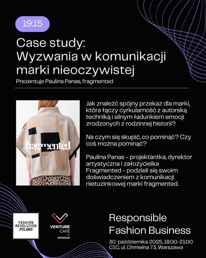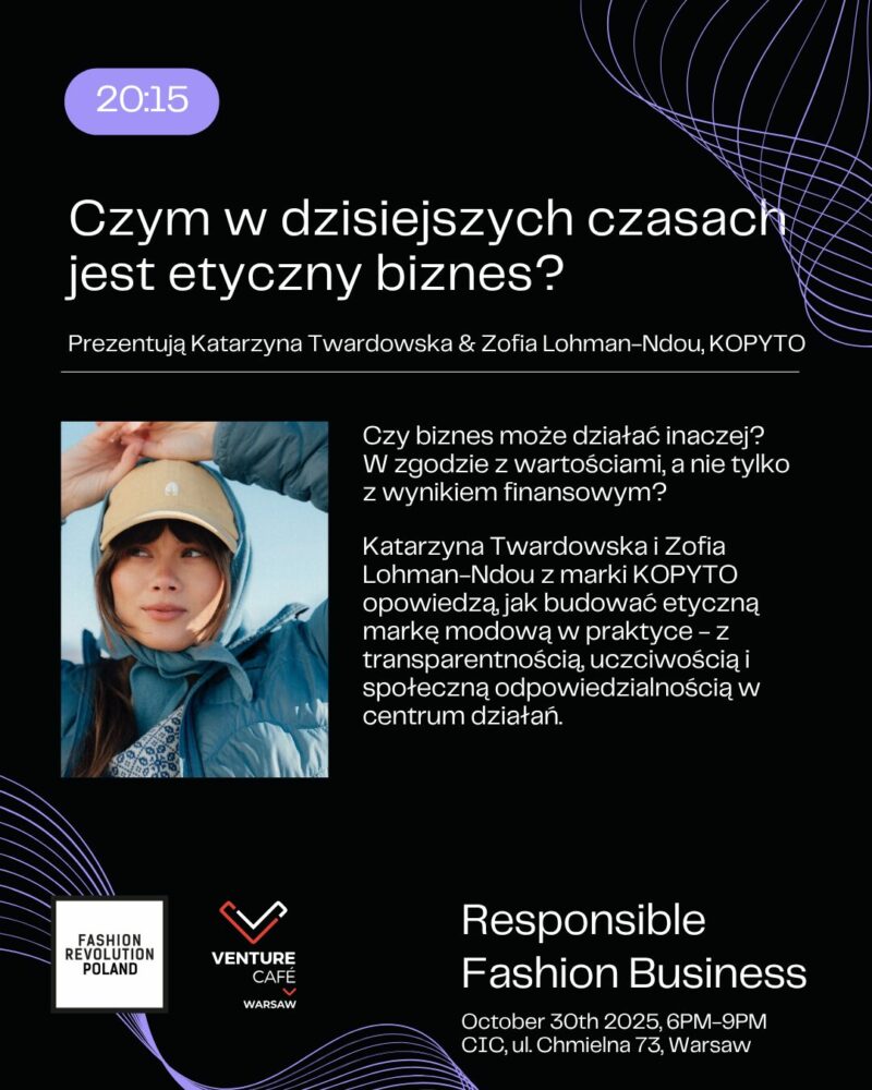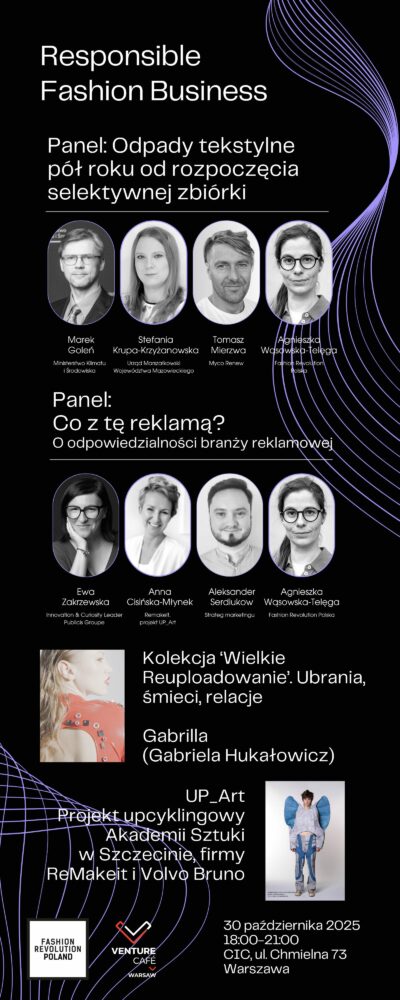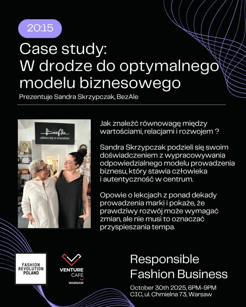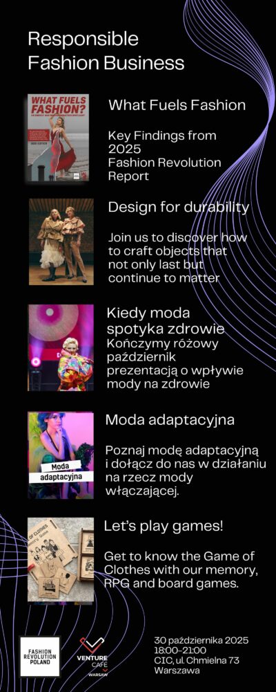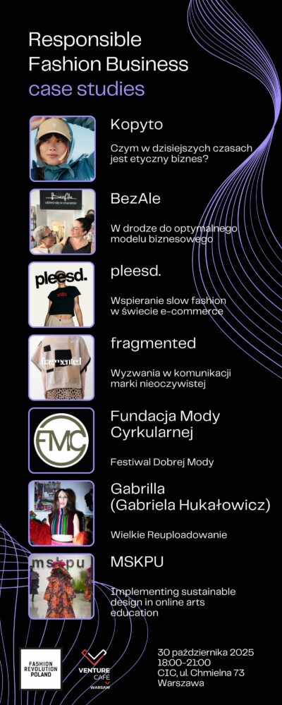 Zapraszamy na konferencję Responsible Fashion Business, stworzoną przez Fashion Revolution Polska i współorganizowaną przez Venture Cafe Warsaw. To wyjątkowe spojrzenie na biznes mody odpowiedzialnej nie tylko przez pryzmat problemów i powinności, ale też rozwiązań i innowacji.