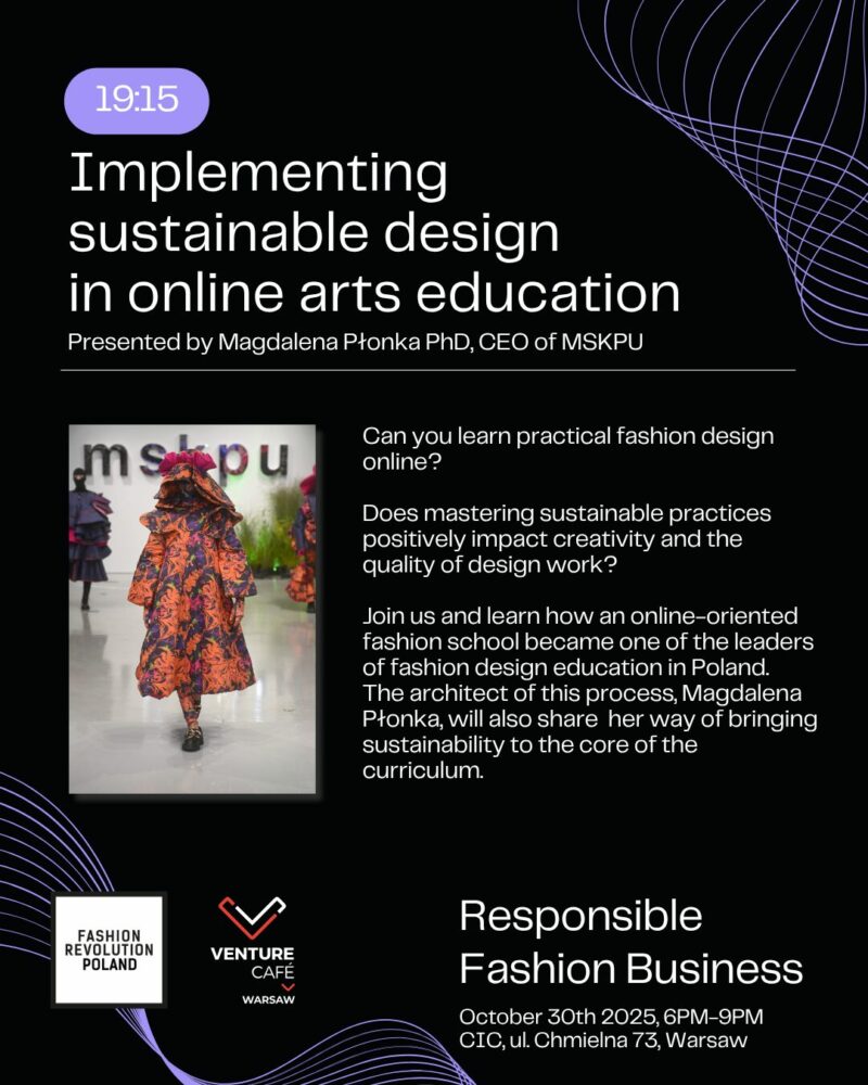 Podczas spotkania dr Magdalena Płonka, dyrektor szkoły mody MSKPU opowie o tym, jak szkoła zorientowana na nauczanie online stała się jednym z liderów edukacji projektantów mody w Polsce. Zdradzi też swój sposób na organizowanie edukacji modowej wokół rdzenia opartego na zrównoważonym rozwoju i zrównoważonym projektowaniu.