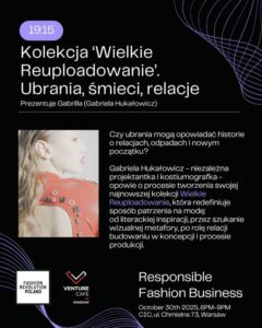 Wielkie reuploadowanie to kolekcja Gabrieli Hukałowicz, tegorocznej absolwentki szkoły mody MSKPU, które w swojej nietuzinkowej, futurystycznej kolekcji wykorzystała elektroodpady m.in. jako tworzywo finezyjnych ozdób. Premiera kolekcji miała miejsce we wrześniu podczas pokazu w Muzeum Etnograficznym w Warszawie, a podczas Responsible Fashion Business jej autorka po raz pierwszy opowie o kulisach jej powstawania.